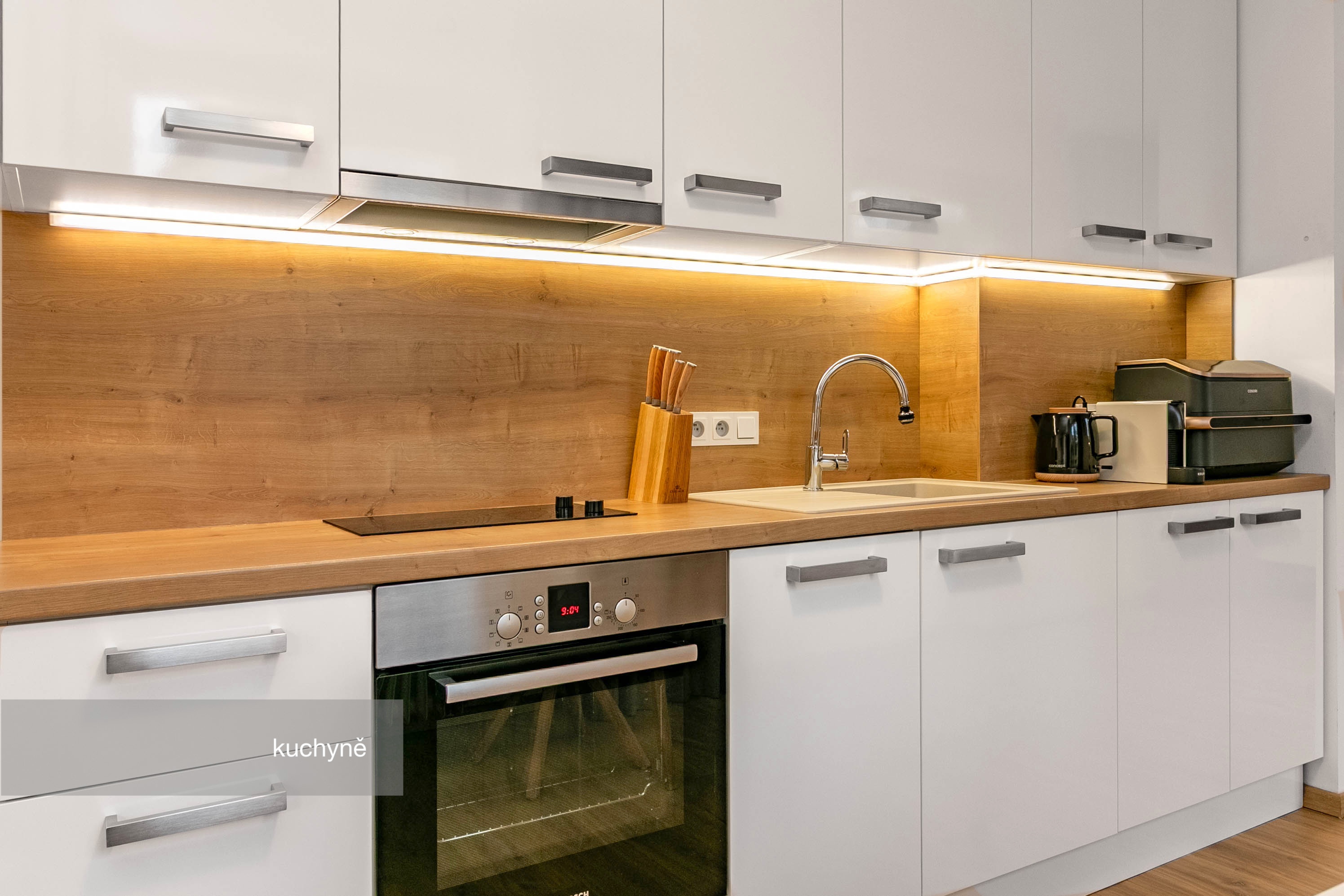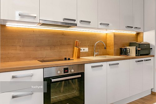 Kuchyňská linka je vybavena moderními značkovými spotřebiči - elektrická trouba, myčka, lednice s mrazákem, digestoř - vše ve značce Bosch, varná deska Electrolux, mikrovlnná trouba Daewoo, parní pračka Whirlpool.
